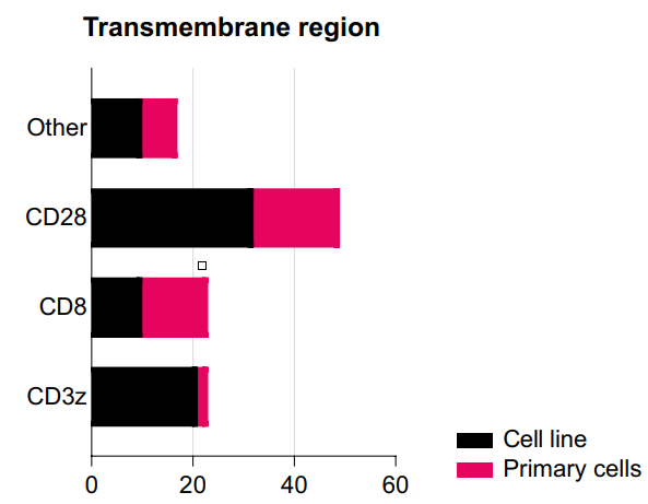 在CD28和CD8α鉸鏈區之間的直接比較中,發現CD28更有可能促進CAR分子的二聚化,因此,CD28鉸鏈區的CAR產生的激活刺激更強。雖然這可能是有益的,但也可能導致更嚴重的副作用。